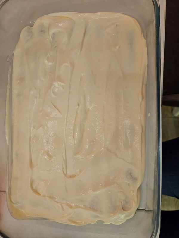 Kada pokrijemo dno posude, polovinom spremljene smese sa sirom premazujemo piškote.